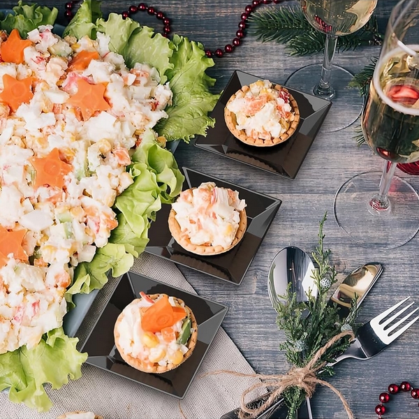The mini tasting plates are Black and chic. Also, they show off small bites. In addition, they work for weddings or parties. For example, serve desserts or appetizers. Then, every dish looks neat.